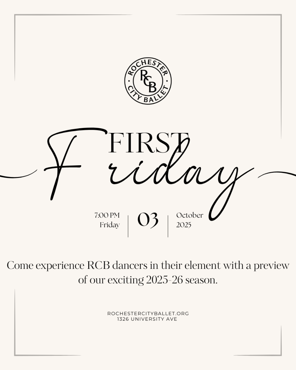 Join Rochester City Ballet for First Friday as they open their studios to the public! Enjoy a sneak preview of the 2025–2026 season, meet the dancers and artistic staff, ask questions, and learn about the exciting growth at RCB. Light beverages and snacks will be provided as you explore the studio space and get an inside look at the company's work.